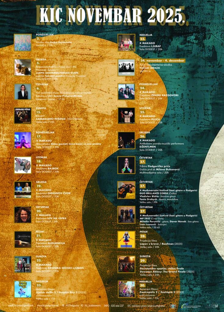 Novembarski repertoar KIC-a „Budo Tomović” donosi brojne događaje, od književnih večeri i koncerata, do filmskih projekcija i izložbi koji povezuju i otvaraju prostor za nova iskustva i susrete s umjetnošću.