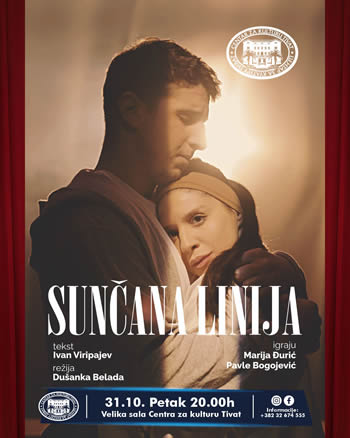Pozorišna predstava “Sunčana linija”, rađena u produkciji Centra za kulturu Tivat, a koju je po tekstu Ivana Viripajeva režirala Dušanka Belada, biće izvedena večeras u 20 časova u Velikoj sali Centra za kulturu Tivat.