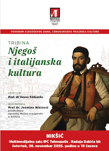 Tribina „Njegoš i italijanska kultura“ na kojoj će govoriti prof. dr Vesna Kilibarda biće održana u četvrtak, 20. novembra u 18 sati u Multimedijalnoj sali Tehnopolisa u Nikšiću (Radoja Dakića bb). Razgovor će moderirati predsjednica nikšićkog Ogranka Matice crnogorske Jasmina Nikčević.